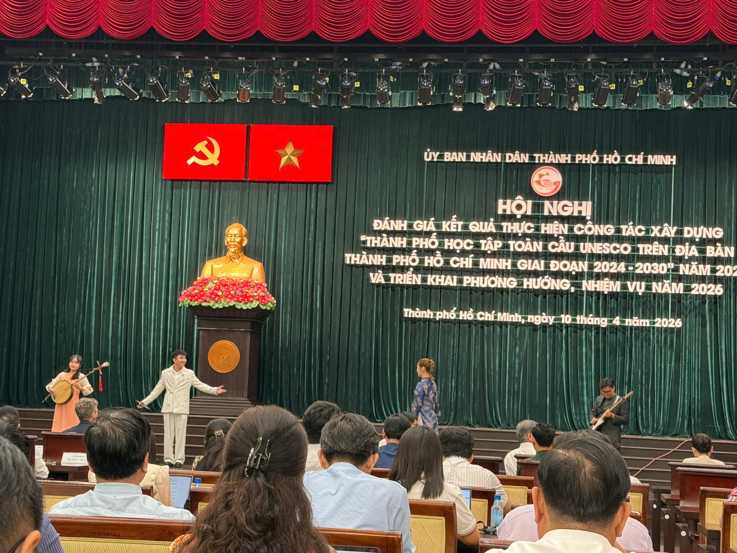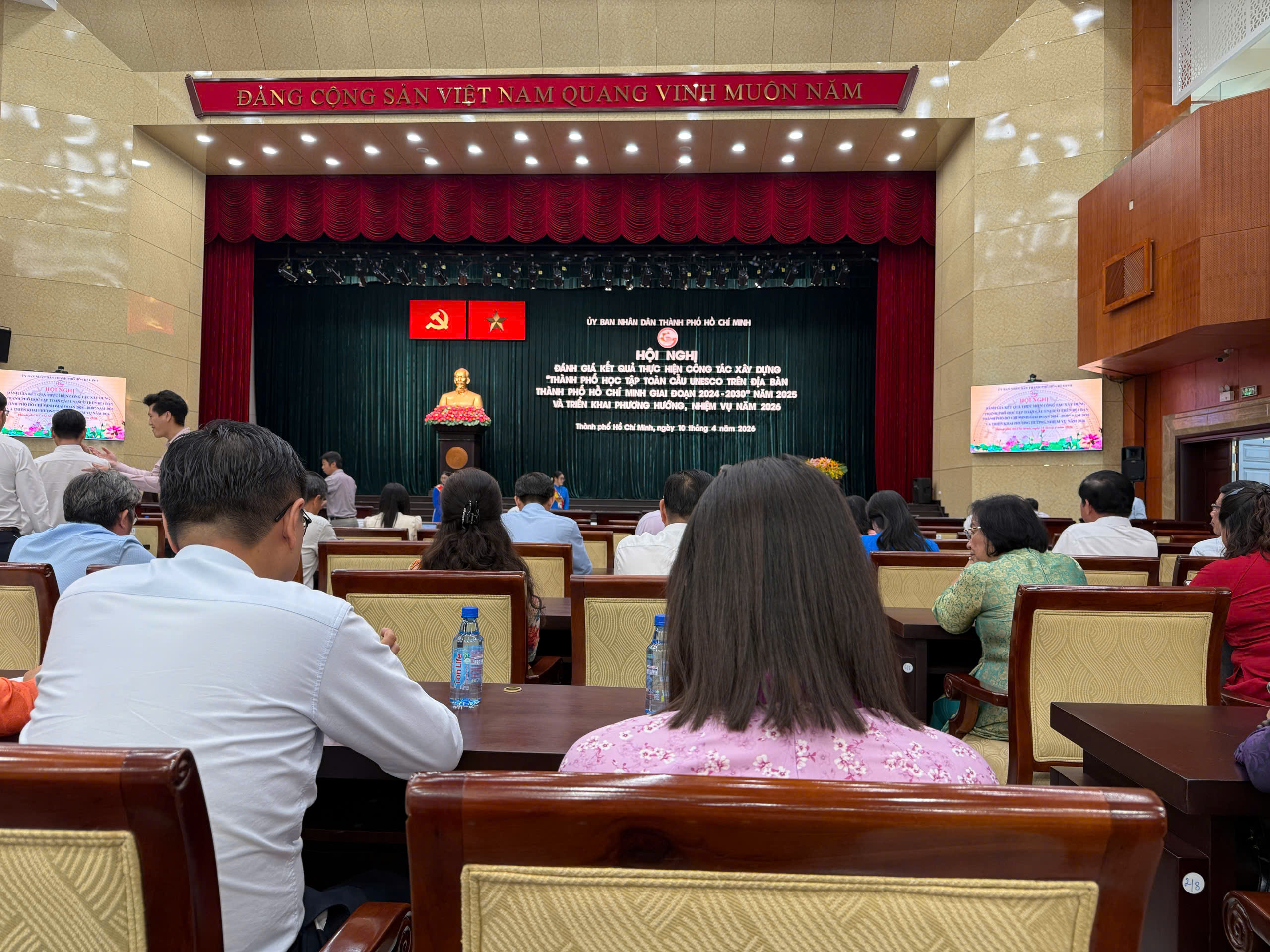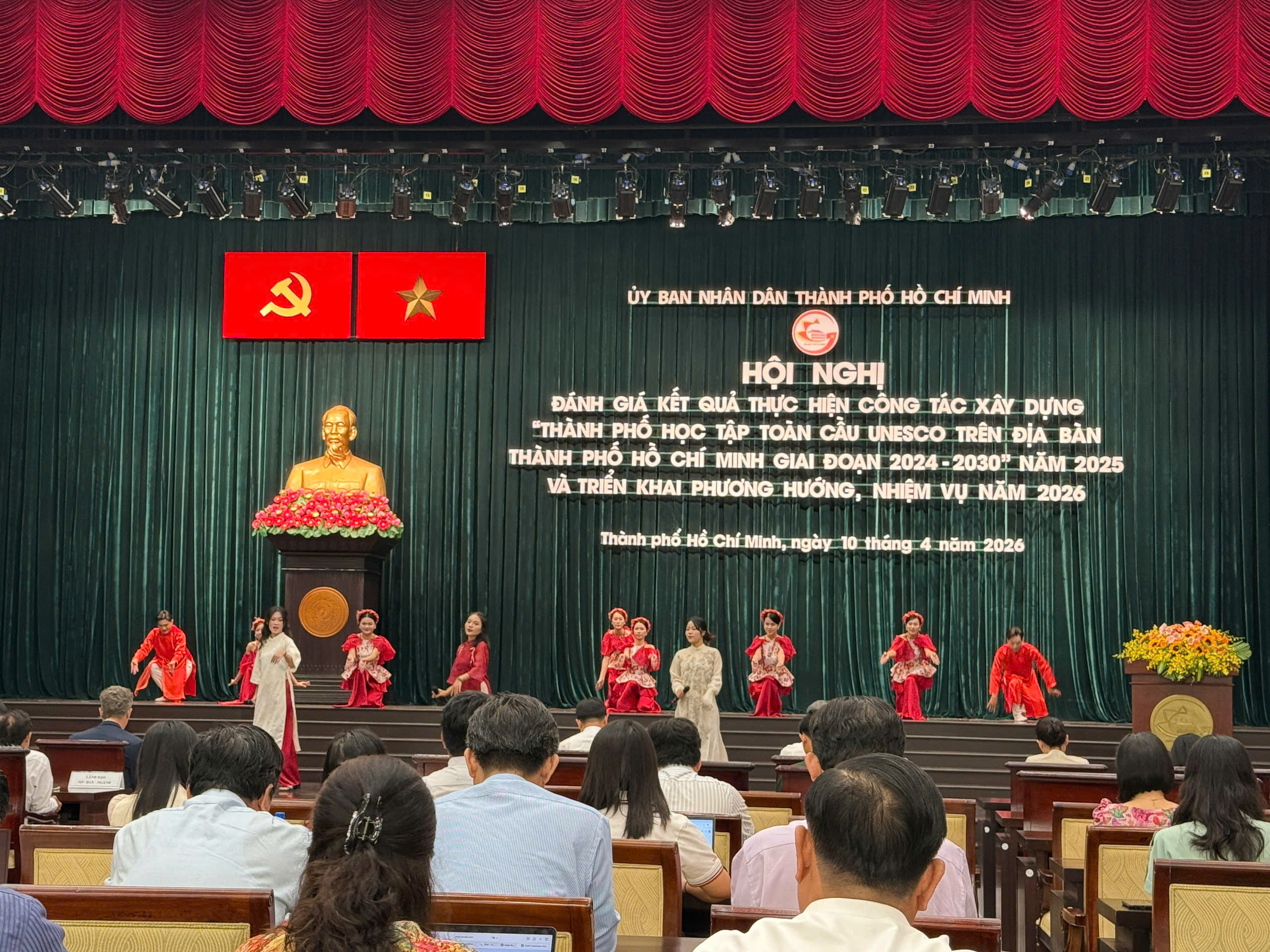 Chiều ngày 10/04/2026, bà Võ Hồng Hạnh – Hiệu trưởng cùng ông Võ Mạnh Đức – Tổng Giám đốc Công ty Cổ phần May In Lụa Ngọc Phước (đơn vị chủ quản) đã đại diện Trường Trung cấp Ngọc Phước tham dự Hội nghị đánh giá kết quả thực hiện công tác xây dựng Thành phố học tập toàn cầu UNESCO trên địa bàn Thành phố Hồ Chí Minh (giai đoạn 2024–2030) năm 2025 và triển khai phương hướng, nhiệm vụ năm 2026.