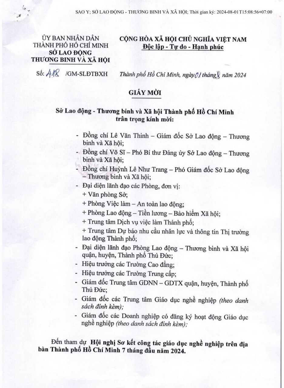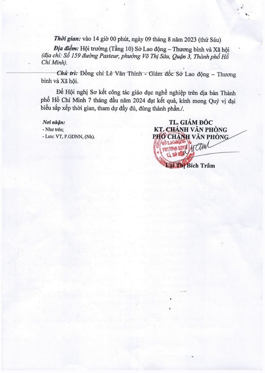 Chiều 09/08/2024, Sở Lao động – Thương binh và Xã hội TPHCM tổ chức Hội nghị sơ kết công tác giáo dục nghề nghiệp 7 tháng đầu năm; triển khai nhiệm vụ trọng tâm 5 tháng cuối năm 2024. Đến dự có các đồng chí: Lê Văn Thinh, Bí thư Đảng ủy, Giám đốc Sở; Huỳnh Lê Như Trang, Phó Giám đốc Sở…, Trường Trung Cấp Ngọc Phước có ông Võ Ân Phước – Chủ tịch HĐQT và bà Trần Huỳnh Linh – Hiệu phó tham dự.