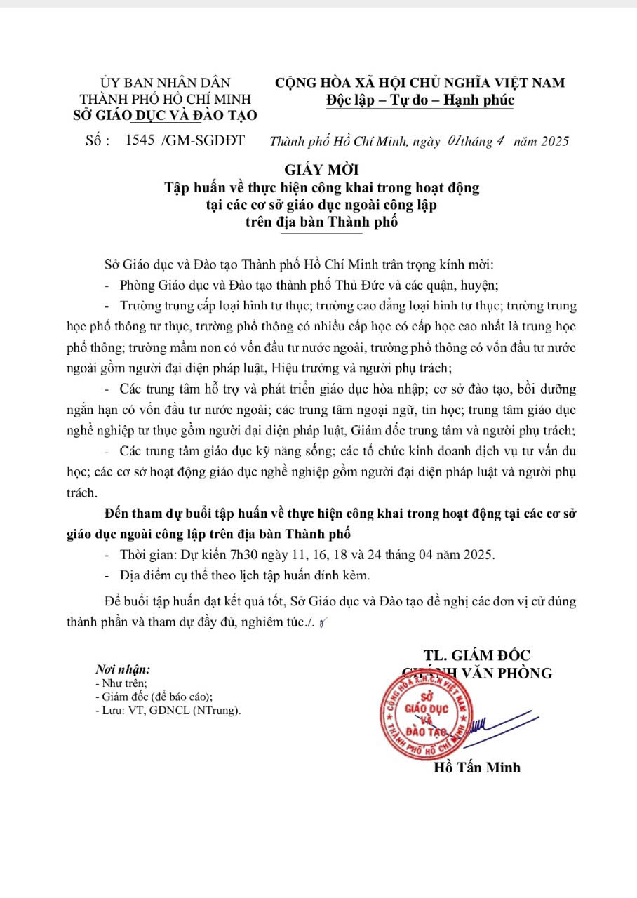 Sáng ngày 11/04/2025, tại Trường THCS – THPT Hồng Hà, Sở Giáo dục và Đào tạo Thành phố Hồ Chí Minh đã tổ chức buổi tập huấn triển khai Thông tư 09/2024/TT-BGDĐT về quy định công khai trong hoạt động của các cơ sở giáo dục thuộc hệ thống giáo dục quốc dân.
