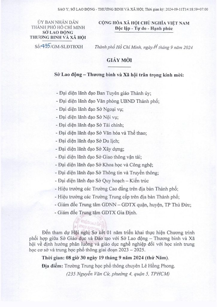 Ngày 19/09/2024, ông Võ Ân Phước – Chủ tịch HĐQT đại diện Trường Trung Cấp Ngọc Phước tham dự Hội nghị sơ kết 01 năm triển khai thực hiện chương trình phối hợp giữa Sở GD & ĐT với SLĐTB&XH về định hướng phân luồng và giáo dục nghề nghiệp đối với học sinh THCS và THPT giai đoạn 2023 – 2025 tại Trường THPT Chuyên Lê Hồng Phong theo giấy mời số 495/GM-SLĐTBXH ngày 11/09/2024.