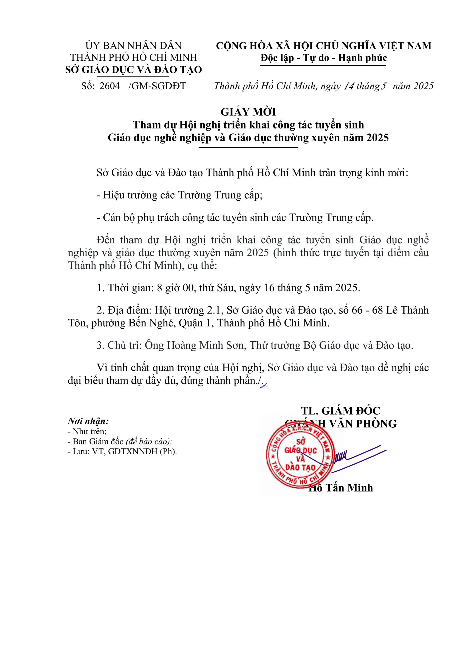 Hội nghị có sự tham dự của lãnh đạo các đơn vị trực thuộc Bộ GD&ĐT, đại diện Sở GD&ĐT, các cơ sở giáo dục nghề nghiệp và giáo dục thường xuyên trên toàn quốc. Tại TP.HCM, hội nghị được tổ chức trực tuyến tại Sở Giáo dục và Đào tạo TP.HCM (66 – 68 Lê Thánh Tôn, phường Bến Nghé, Quận 1). Trường Trung cấp Ngọc Phước cử bà Đoàn Nguyễn Gia Hân làm đại diện tham dự hội nghị tại điểm cầu TP.HCM.