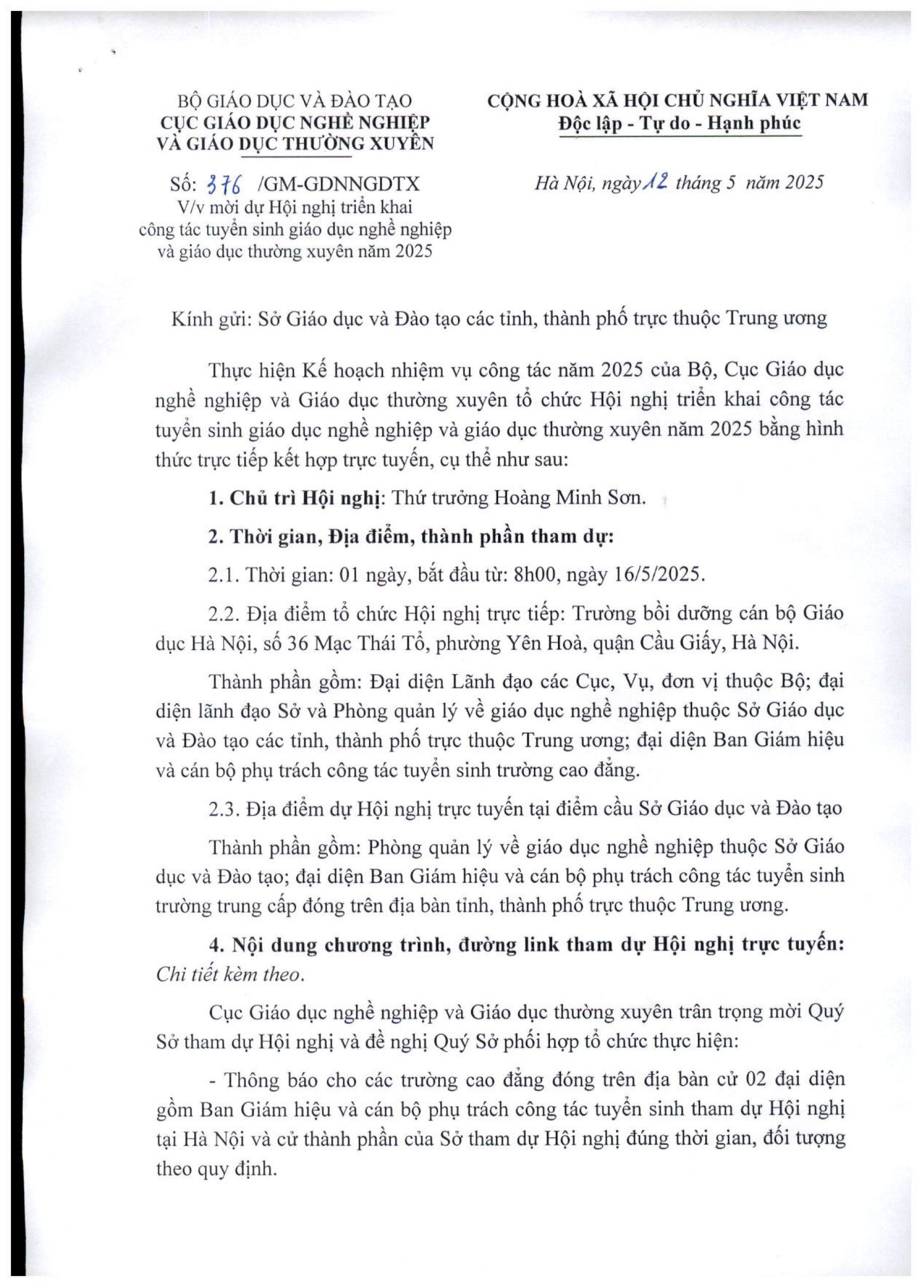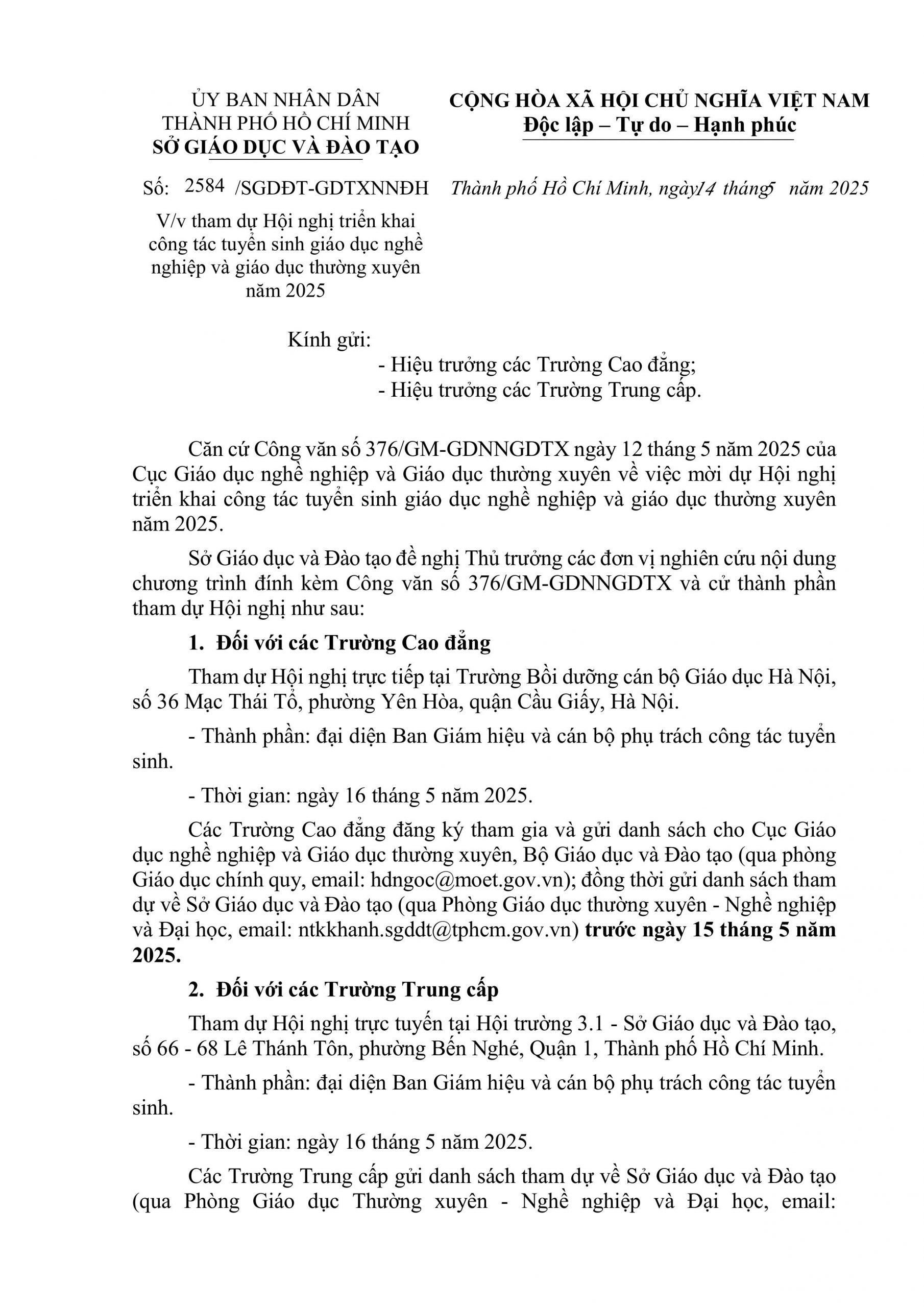 Hội nghị có sự tham dự của lãnh đạo các đơn vị trực thuộc Bộ GD&ĐT, đại diện Sở GD&ĐT, các cơ sở giáo dục nghề nghiệp và giáo dục thường xuyên trên toàn quốc. Tại TP.HCM, hội nghị được tổ chức trực tuyến tại Sở Giáo dục và Đào tạo TP.HCM (66 – 68 Lê Thánh Tôn, phường Bến Nghé, Quận 1). Trường Trung cấp Ngọc Phước cử bà Đoàn Nguyễn Gia Hân làm đại diện tham dự hội nghị tại điểm cầu TP.HCM.