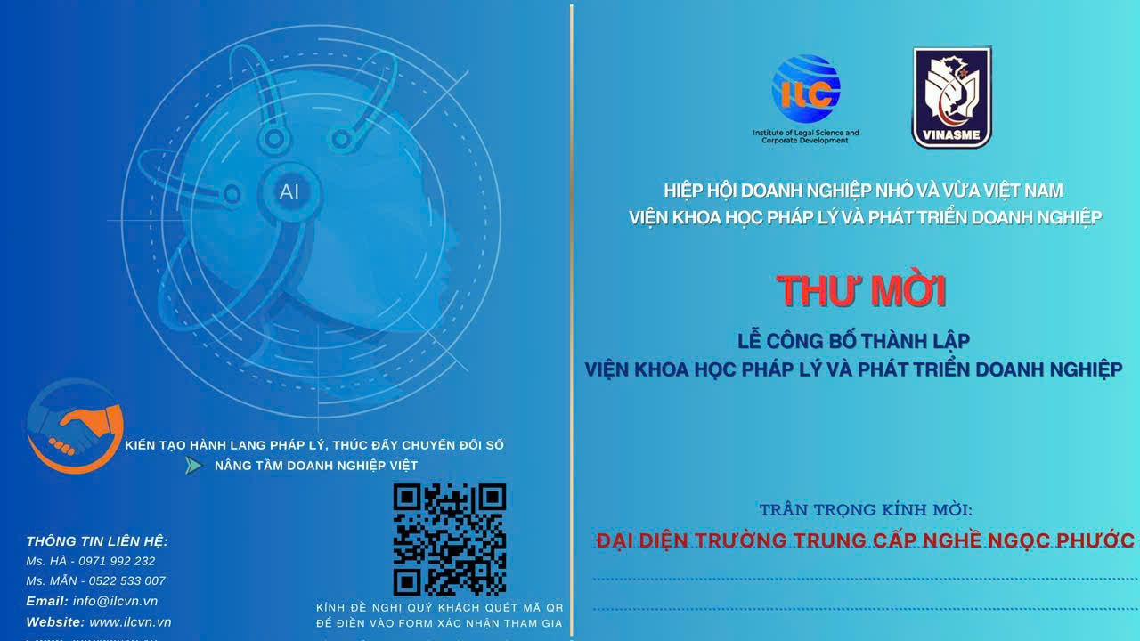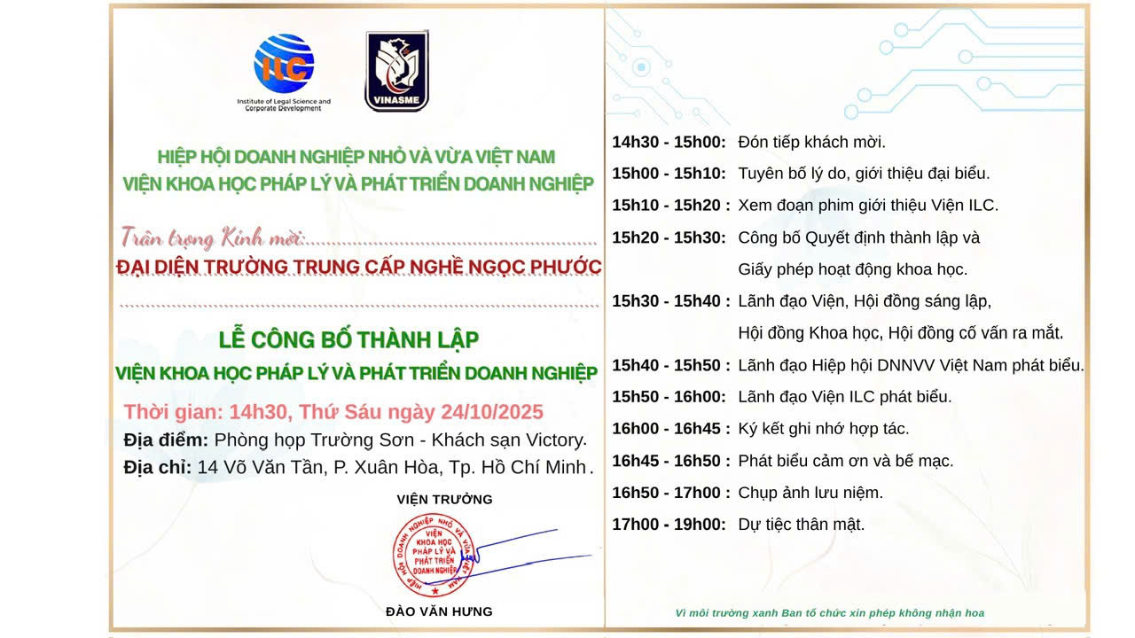 Chiều ngày 24/10/2025, đại diện Trường Trung Cấp Ngọc Phước là ông Võ Ân Phước – Chủ tịch Hội đồng Quản trị đã tham dự Lễ công bố thành lập Viện Khoa học Pháp lý và Phát triển Doanh nghiệp, trực thuộc Hiệp hội Doanh nghiệp nhỏ và vừa Việt Nam, được tổ chức trang trọng tại Khách sạn Victory, TP. Hồ Chí Minh.