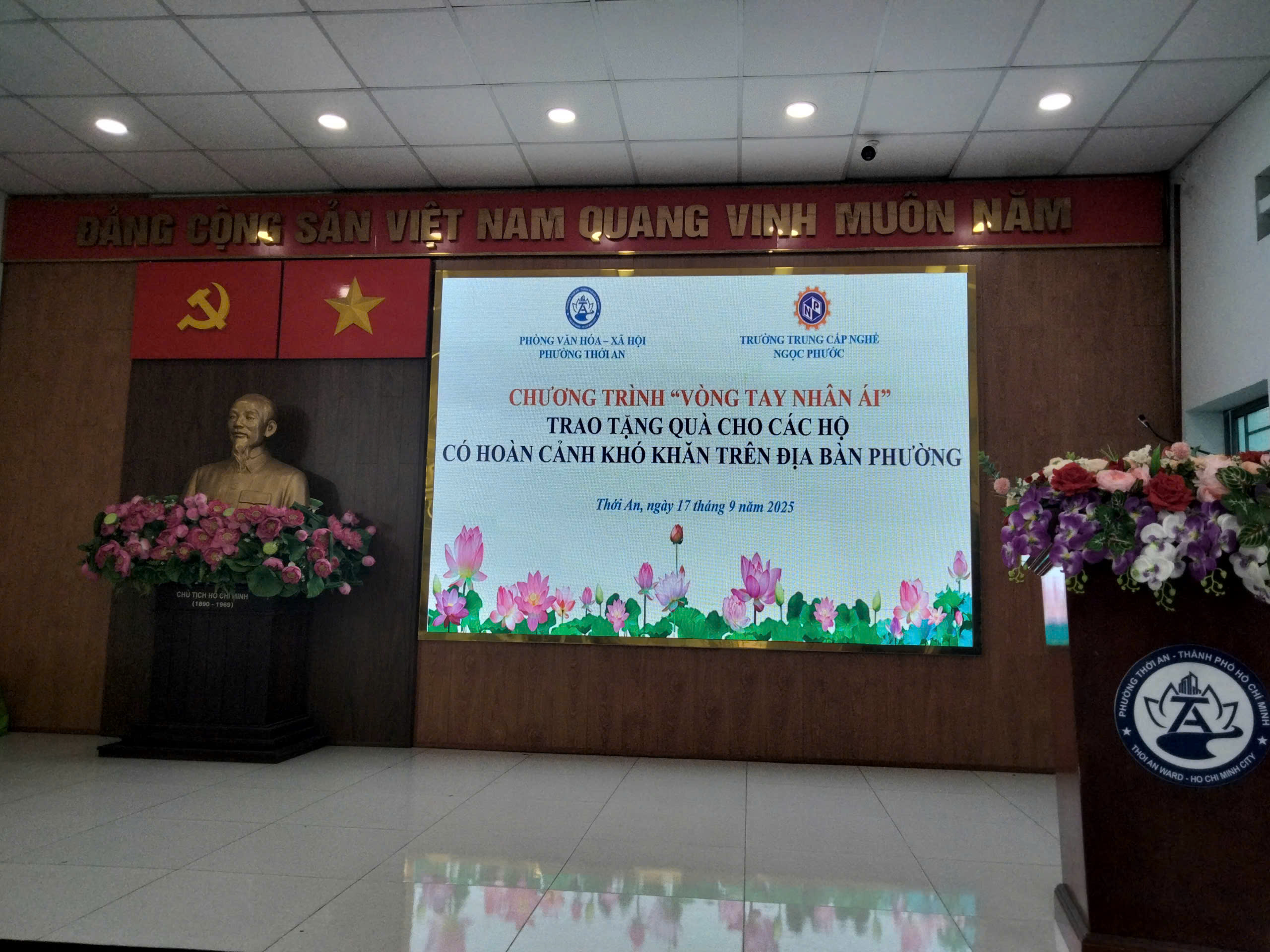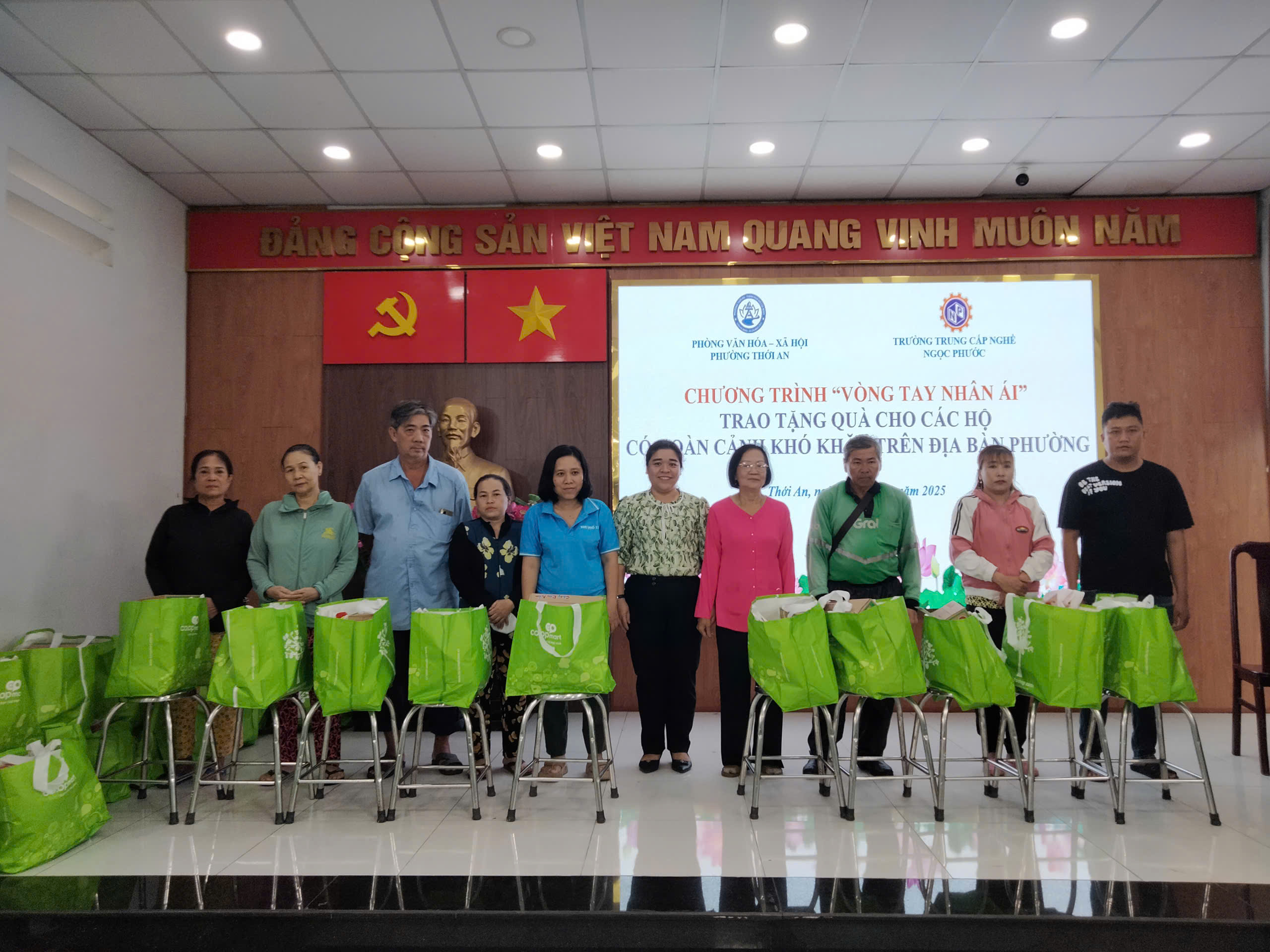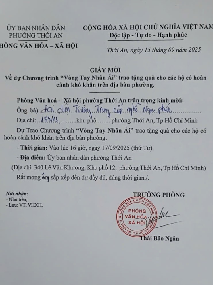 Vào lúc 16h ngày 17/09/2025, Trường Trung Cấp Ngọc Phước phối hợp cùng Phòng Văn hóa – Xã hội Phường Thới An tổ chức chương trình “Vòng tay nhân ái – Trao tặng quà cho các hộ có hoàn cảnh khó khăn trên địa bàn Phường”.